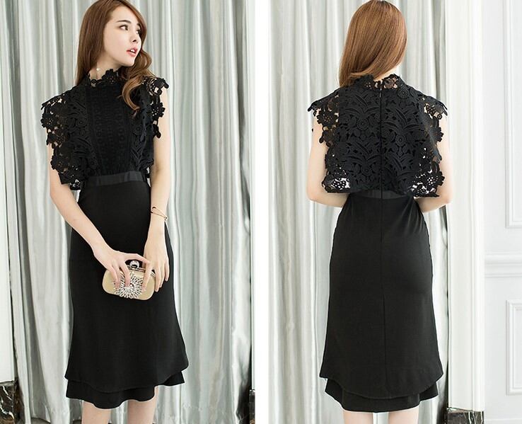 レース重ねブラックドレス ハイウエスト ノースリーブ シック エレガント 結婚式 二次会 パーティー H1010