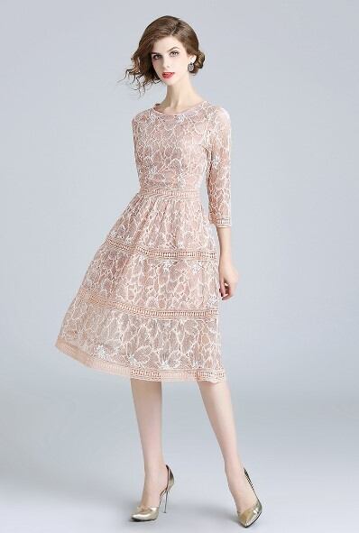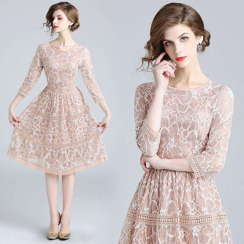 エレガント 総レースミディ丈ドレス ワンピース 7分袖 ラウンドネック ヌーディーカラー フェミニン 結婚式 二次会 パーティー 謝恩会 お食事会 H1022