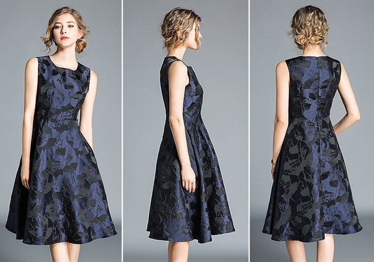 光沢と立体感のあるブルー×ブラックの柄が高級感のあるノースリーブドレス。