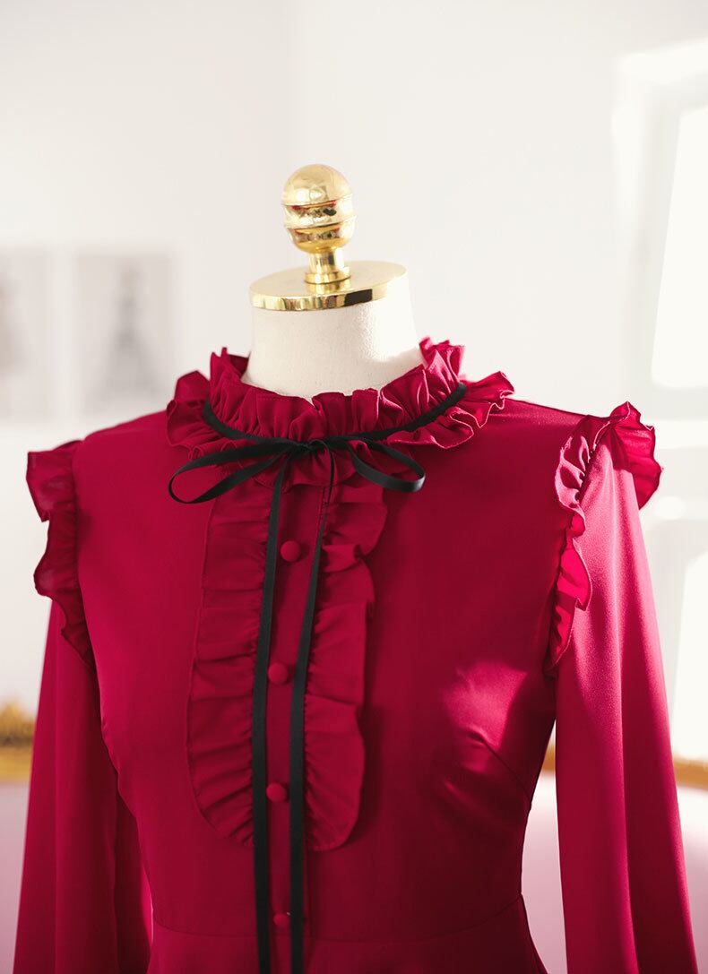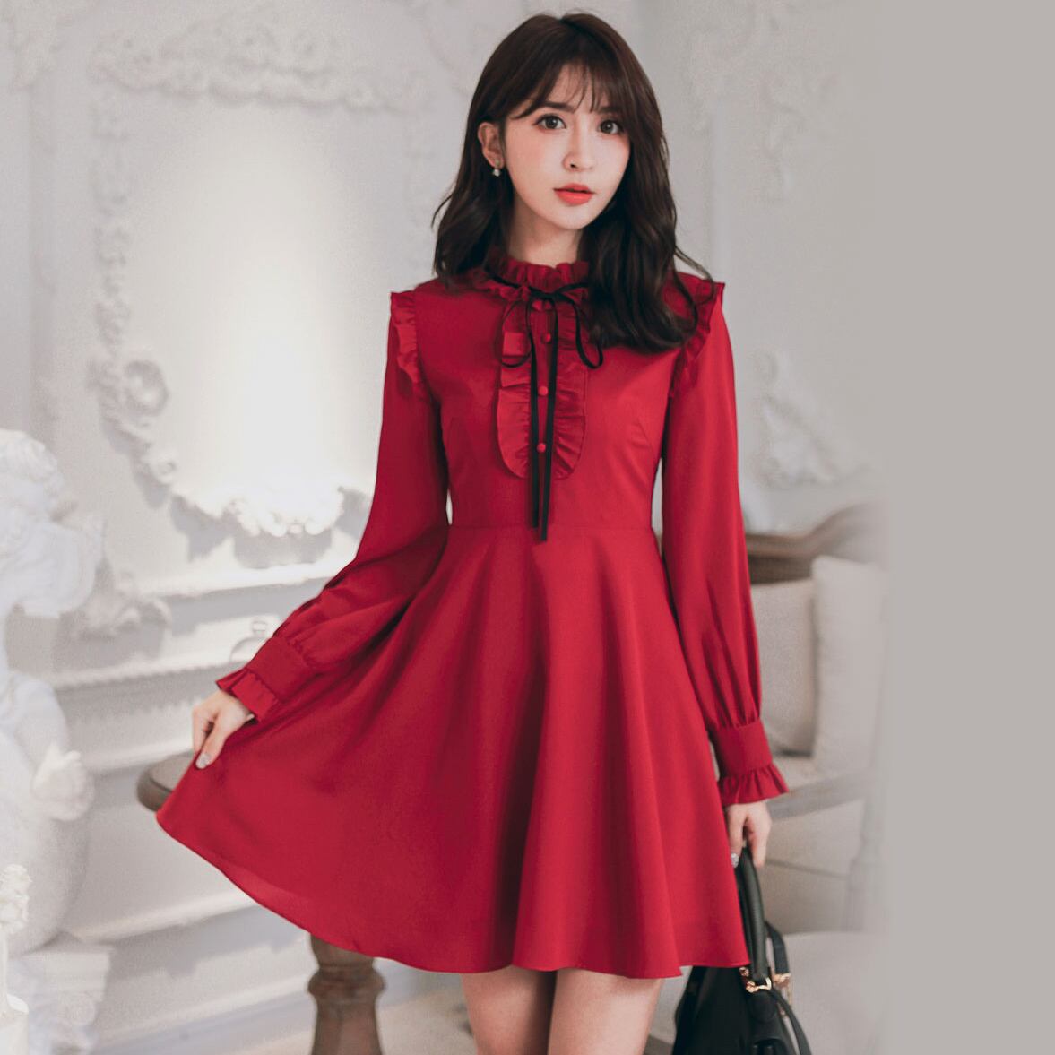 シフォンフリルミニドレス クラシカル ロマンティック ガーリー スタンドカラー リボン ハイウエスト フレアスカート 結婚式 二次会 パーティー イベント クリスマス H1040