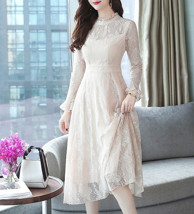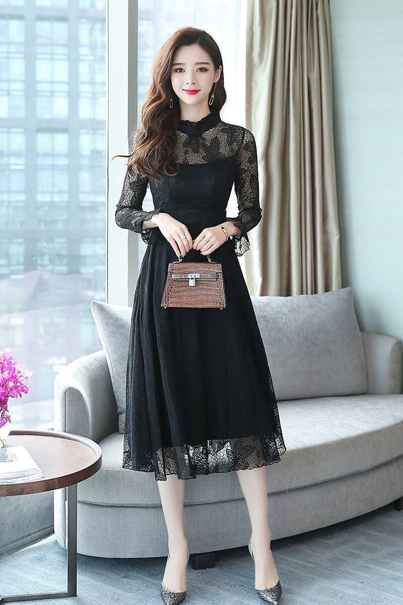 ボタニカル風 総レースミディ丈ドレス 葉柄 スタンドカラー シアー 透け感 エレガント 秋冬 結婚式 披露宴 パーティー H1047