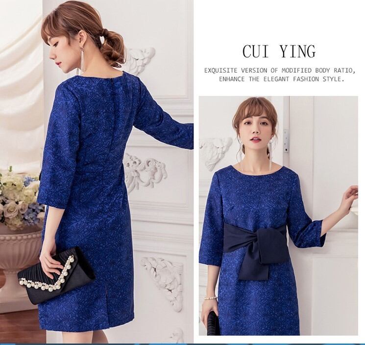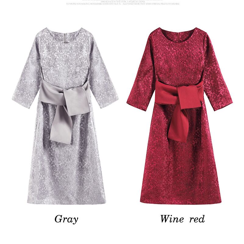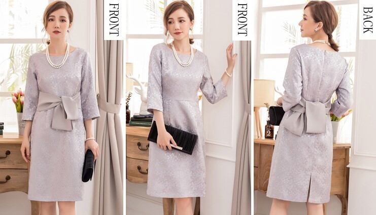レトロシック♡花柄模様 ウエストリボン付きドレス 7分袖 ラウンドネック ひざ丈 華やか 秋冬 結婚式 披露宴 パーティー イベント H1050