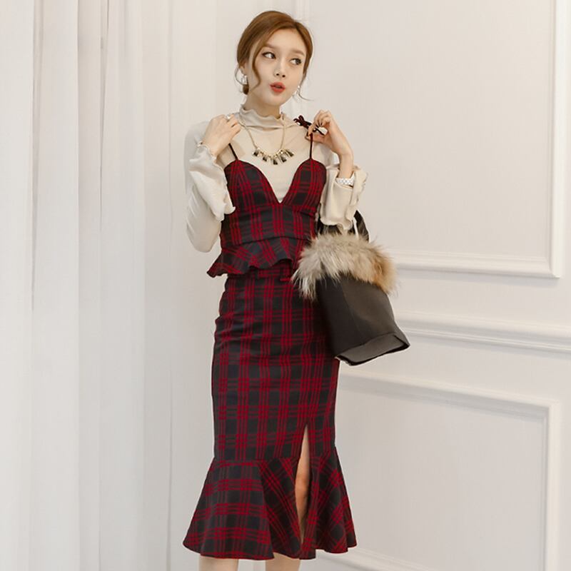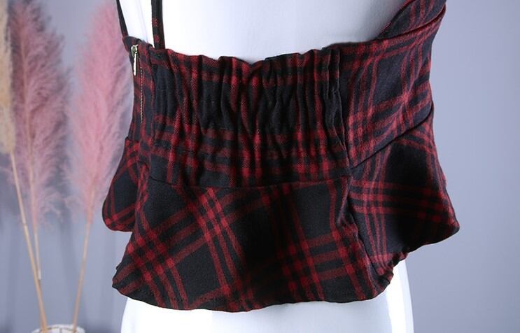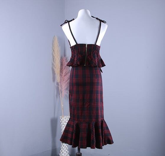 ポップでかわいい パーティーコーデ チェック柄セットアップ ペプラムビスチェ フラウンス付きミディ丈スカート ベルト付き スリット入り ガーリー かわいい トレンド パーティー イベント H1062