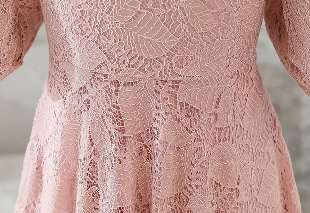 ドレープが自慢☆総レースミディ丈ドレス 9分袖 リボンタイ フレアスカート リーフ柄 落ち感 エレガント フェミニン クラシカル 結婚式 パーティー イベント H1073
