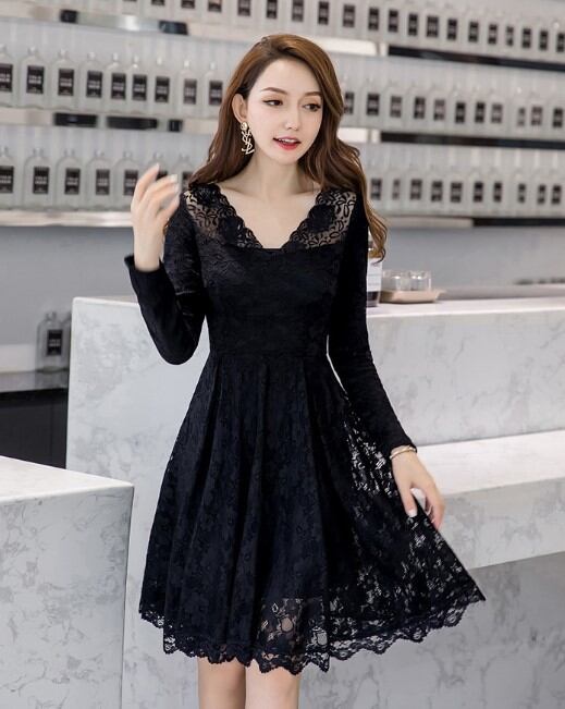 総レースVネックブラックドレス 長袖 ミディ丈 ウエストシェイプ デコルテ魅せ エレガント フェミニン 結婚式 パーティー H1082