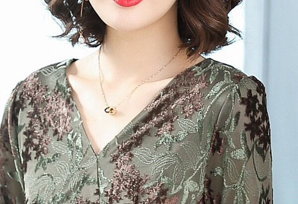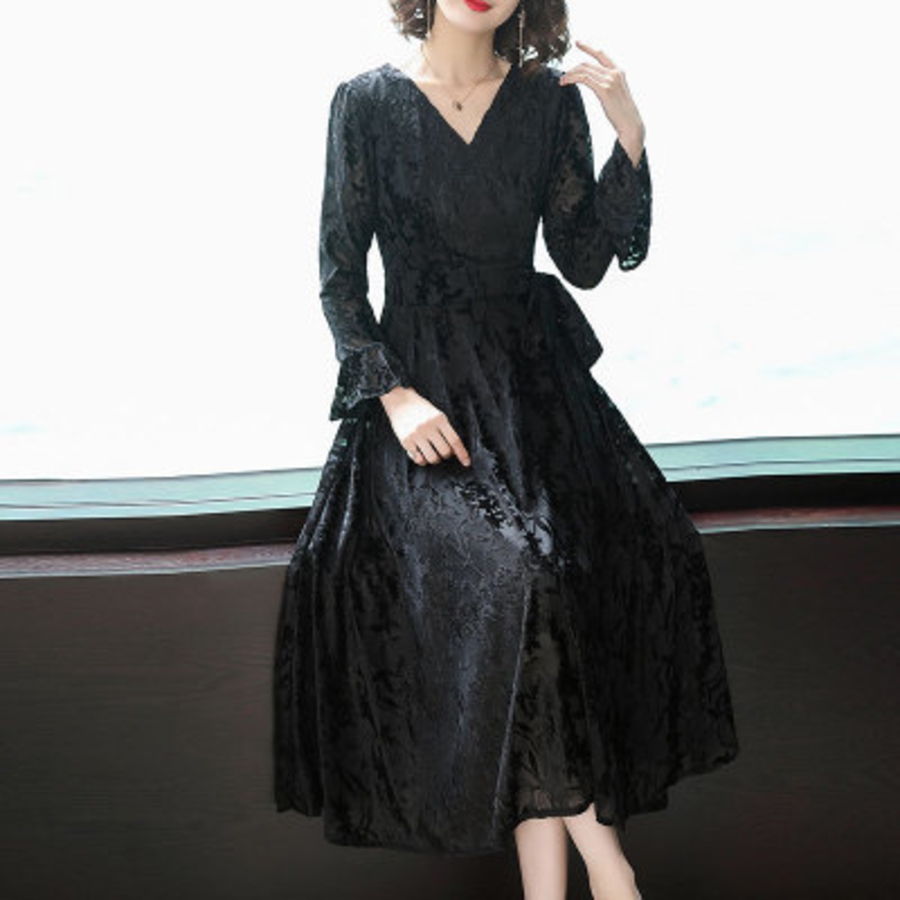 とってもシックなジャガード風模様のVネックロングドレスです。