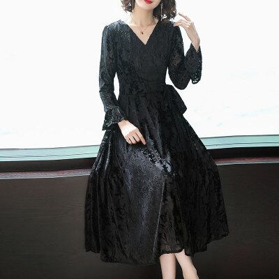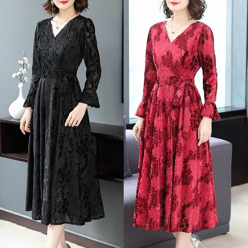 シックなジャカード風柄 Vネックロングドレス フレアスカート ウエストリボン 袖フリル エレガント ゴージャス 秋冬 結婚式 パーティー イベント お食事 H1097