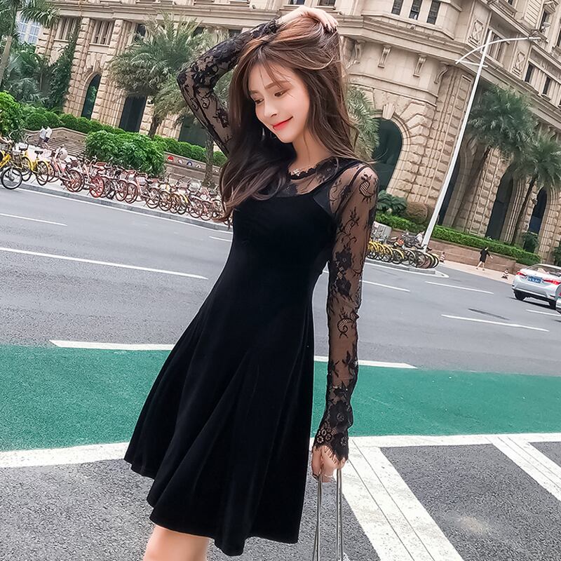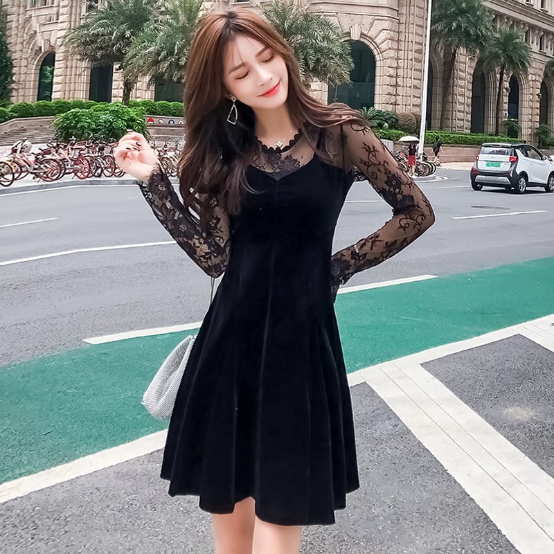 ベルベット風ブラックドレス ドッキングデザイン レース切替 Aライン セクシー ハイウエスト ガーリー 肌見せ 結婚式 二次会 パーティー イベント 秋冬 H1099