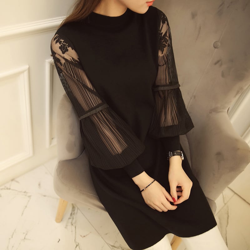 袖レースニットワンピース ミニ丈 サイドスリット ランタンスリーブ 秋冬 エレガント シック パーティー お呼ばれ H1102