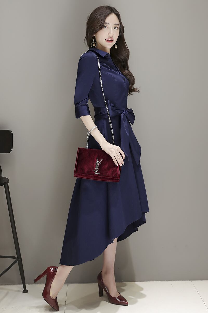 フィッシュテールミディ丈ワンピース シャツワンピース ウエストリボン 7分袖 フェミニン マニッシュ 光沢感 パーティー お呼ばれ お食事 H1104