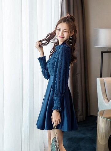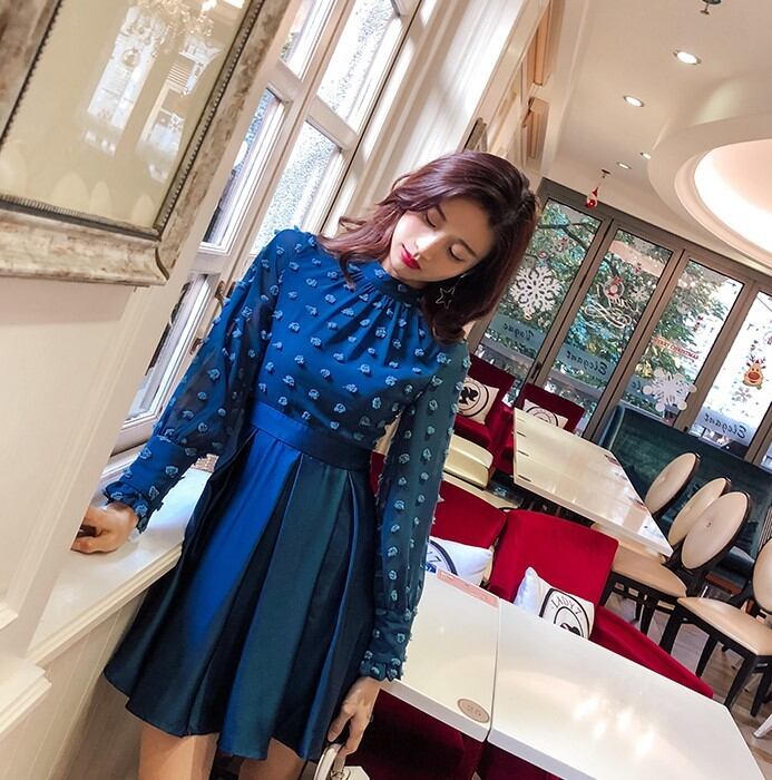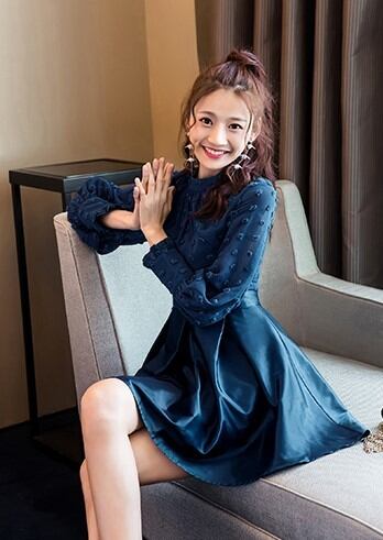 キュート♡ポンポンモチーフ付きミニドレス ハイウエスト バックジップアップ タックスカート 透け感 シアー スタンドカラー シック H1105