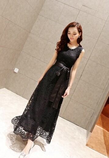 ノースリーブ総レースドレス マキシ丈 バックジップアップ Aライン ウエストリボン ドレッシー エレガント H1112