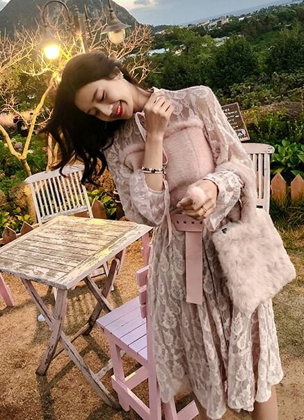 ラブリーな総レースミディ丈ドレス ボア調切替 長袖 スタンドカラー ベルト付き ハイウエスト ベルスリーブ H1114