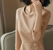7分袖ひざ丈Aラインドレス 袖レース ピンアクセント付き ハイウエスト バックジップアップ シック きれいめ フェミニン 上品 ヌードカラー 秋冬 H1126