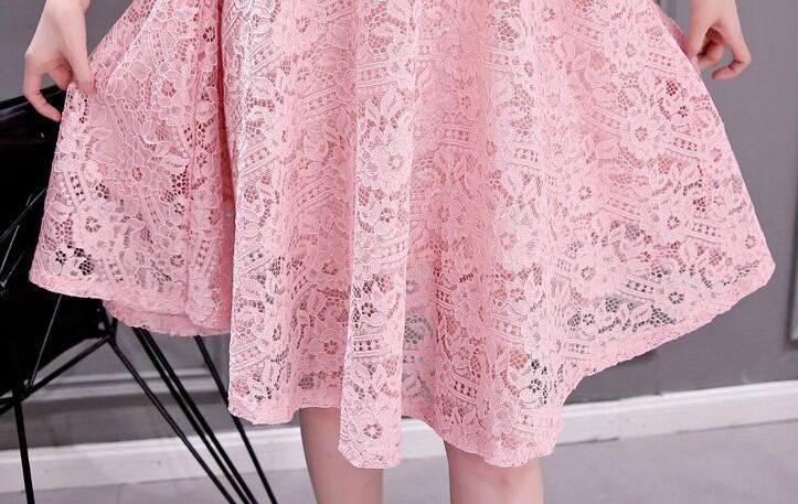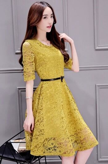 総レース半袖ドレス ひざ丈 Aライン ラウンドネック バックジップアップ 定番 ベーシック エレガント ドレッシー 結婚式 パーティー H1135