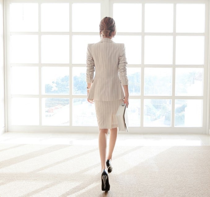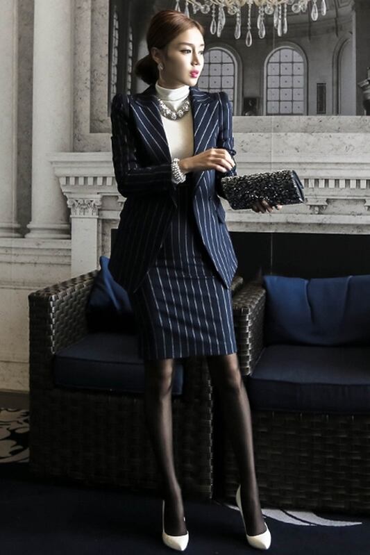 マニッシュなストライプ柄のジャケットとワンピースのセットアップです。