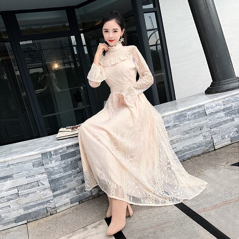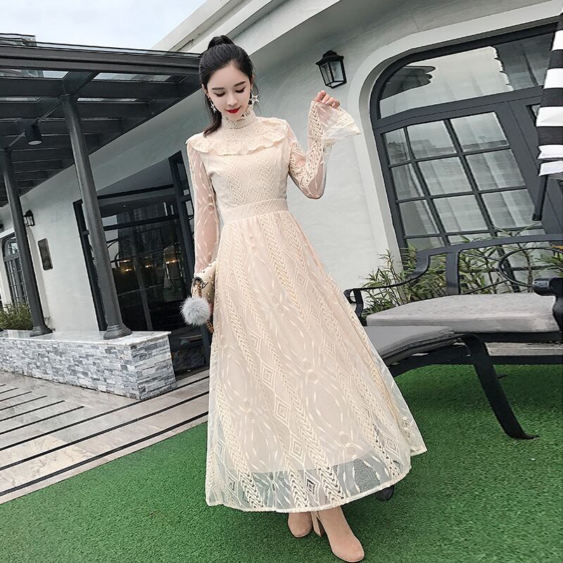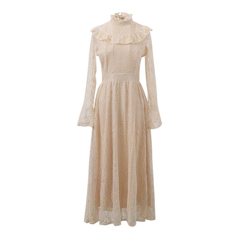 ロマンティック レースマキシ丈ドレス スタンドカラー ハイウエスト ベルスリーブ フリル ガーリー sweet 結婚式 パーティー イベント H1149