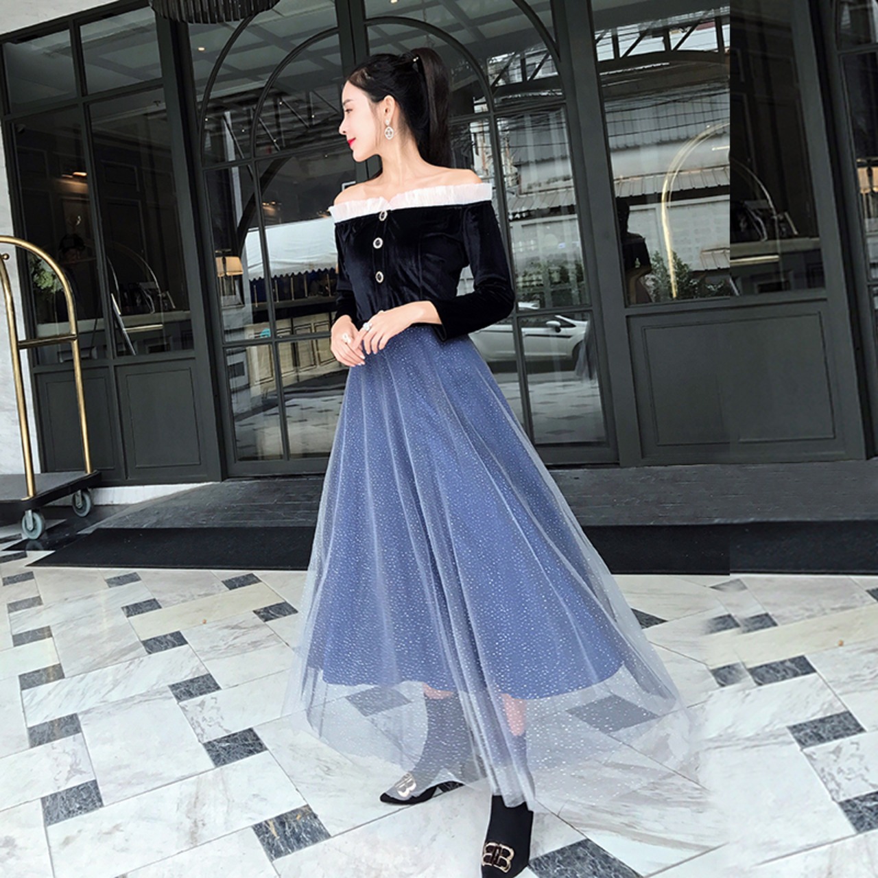 パーティーにおススメ☆セットアップ ツーピース オフショルトップス シースルーロングスカート フリル付き ベロア調 ドレープ 透け感 スタイリッシュ シック H1150