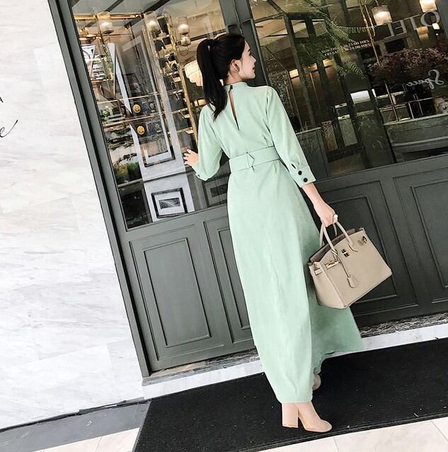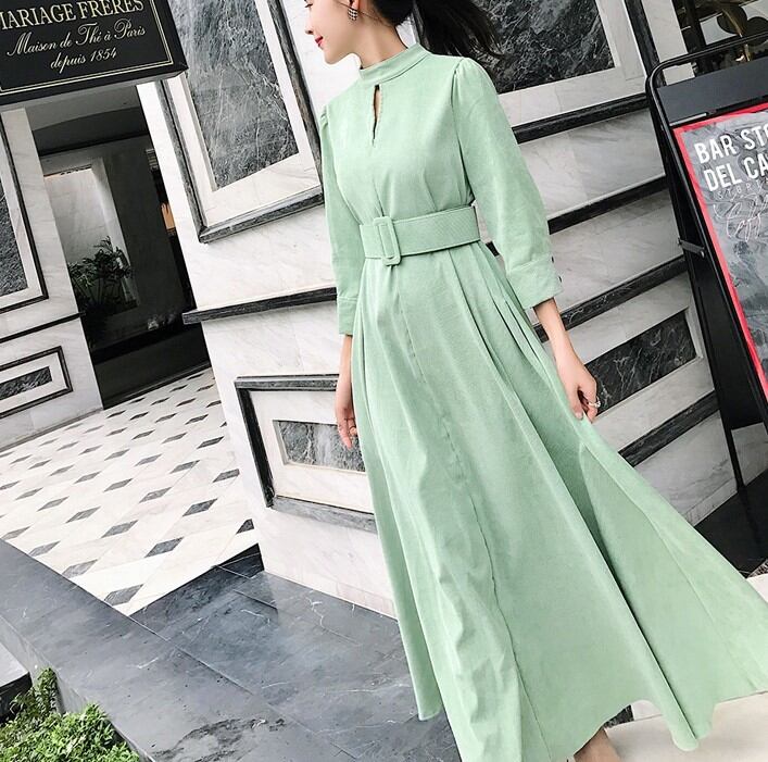 細畝コーデュロイ スタンドカラー マキシ丈ドレス ベルト付き ハイウエスト 脚長見せ シック スタイルアップ 肌見せ オシャレ 秋冬 H1152