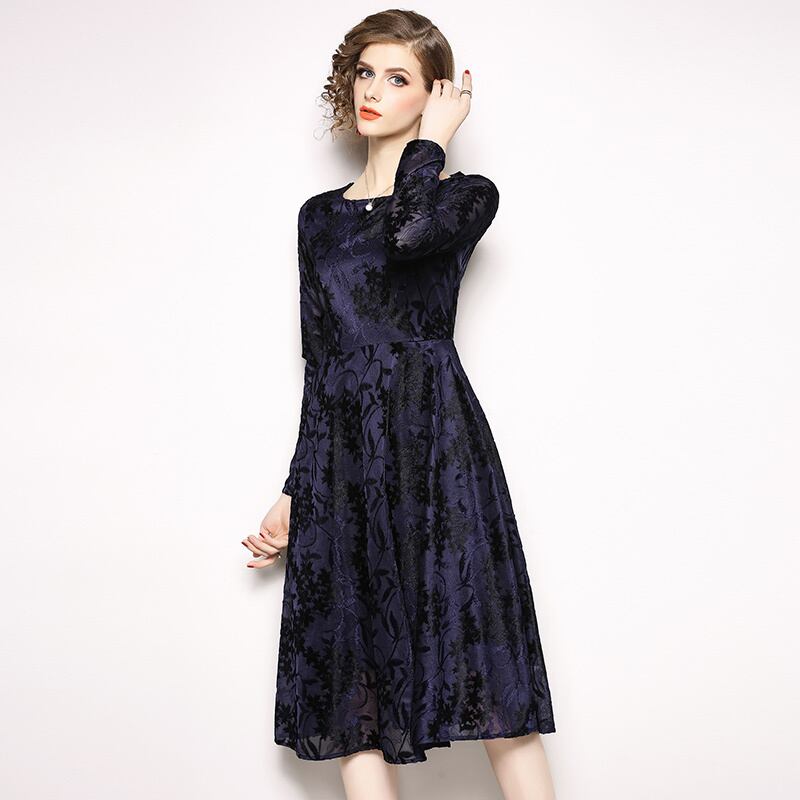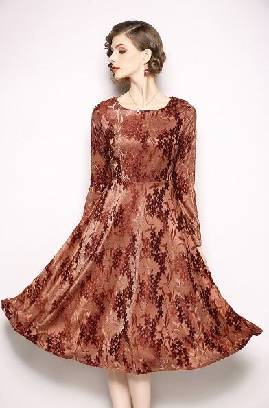 ラウンドネックAラインドレス ベロア調柄 長袖 ミディ丈 シック エレガント 秋冬 H1166