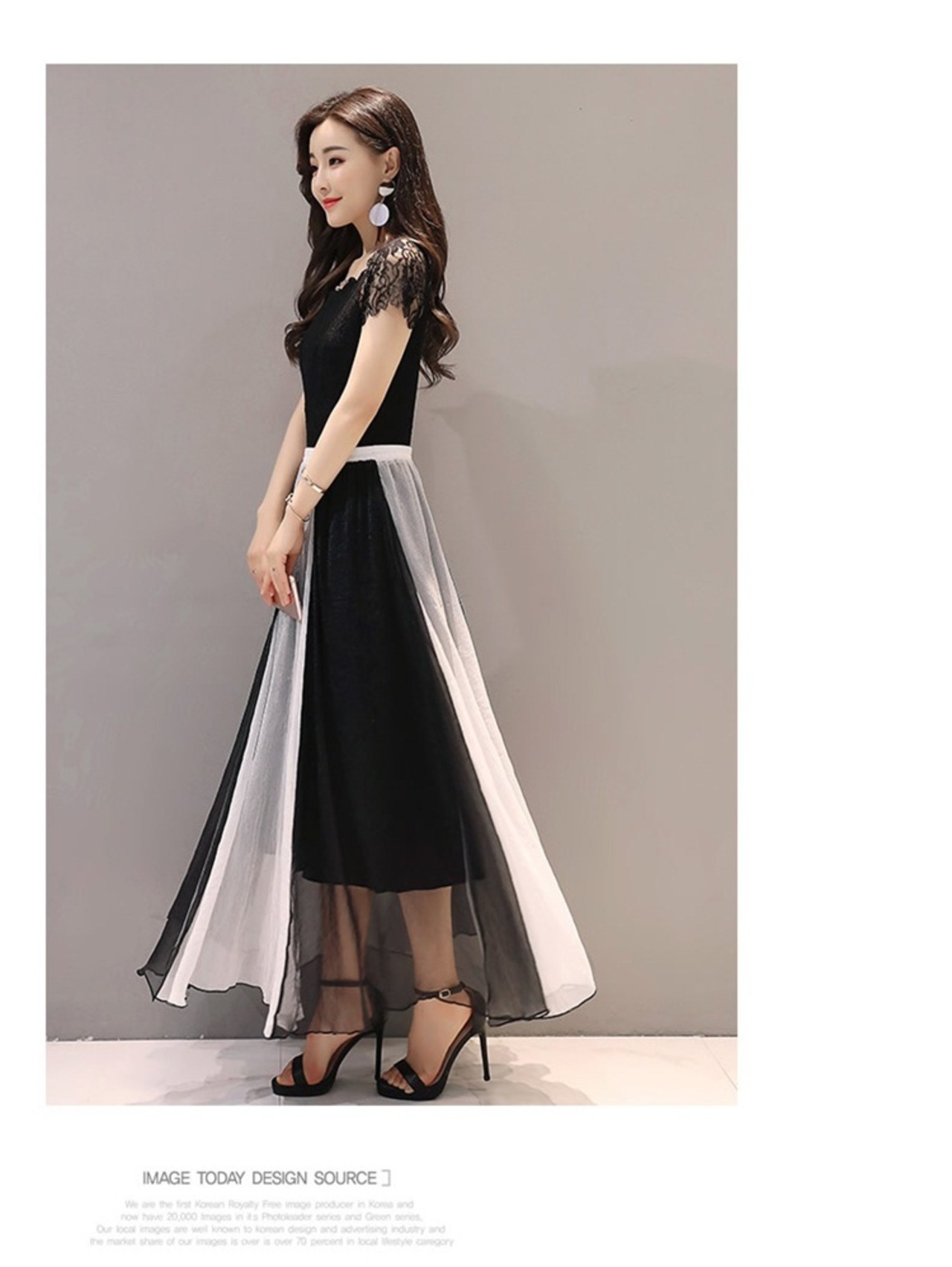 シアー感のあるレースと、安心感のあるマキシ丈シフォンスカートでリュクスムードたっぷりのワンピースドレス。
