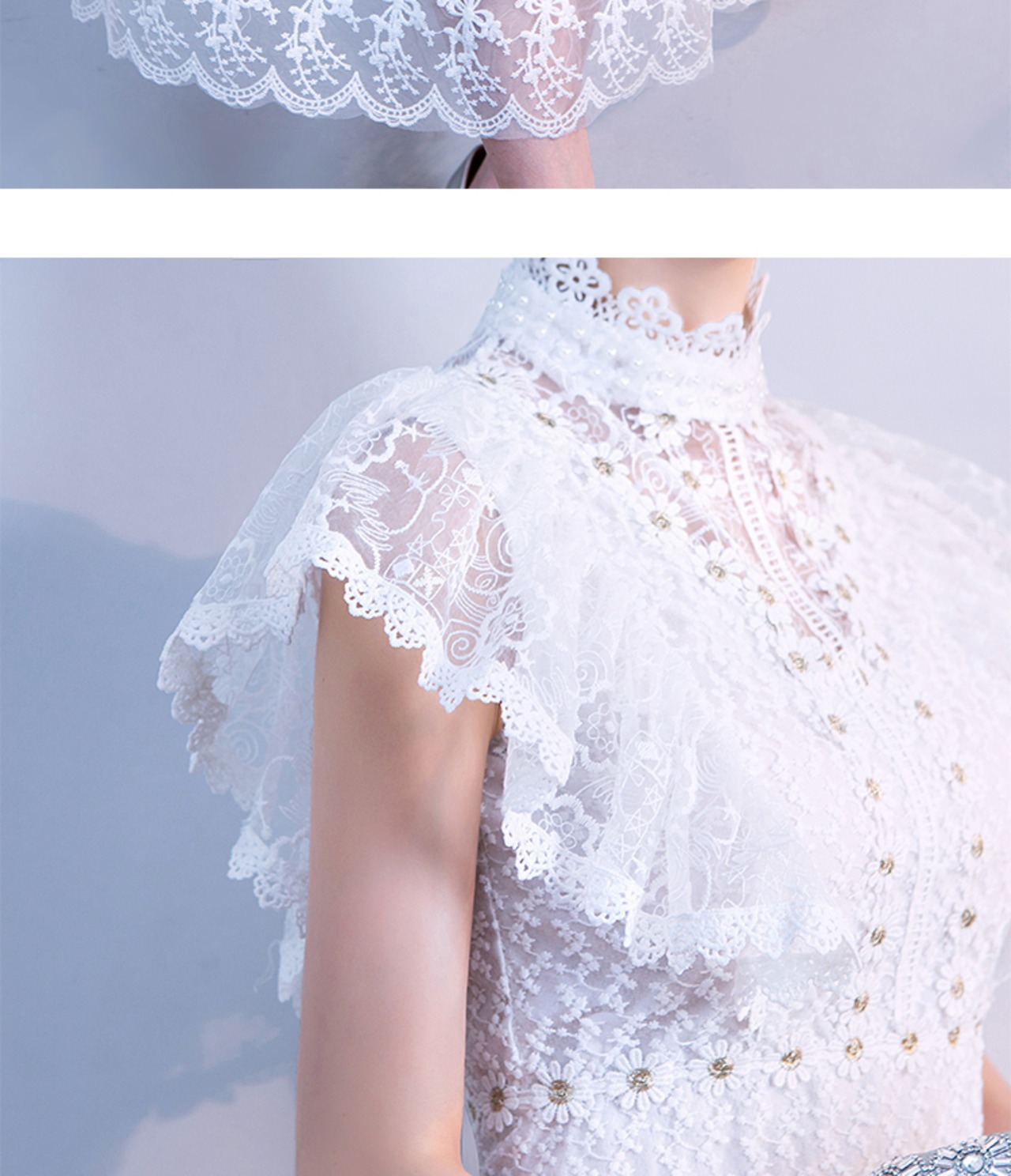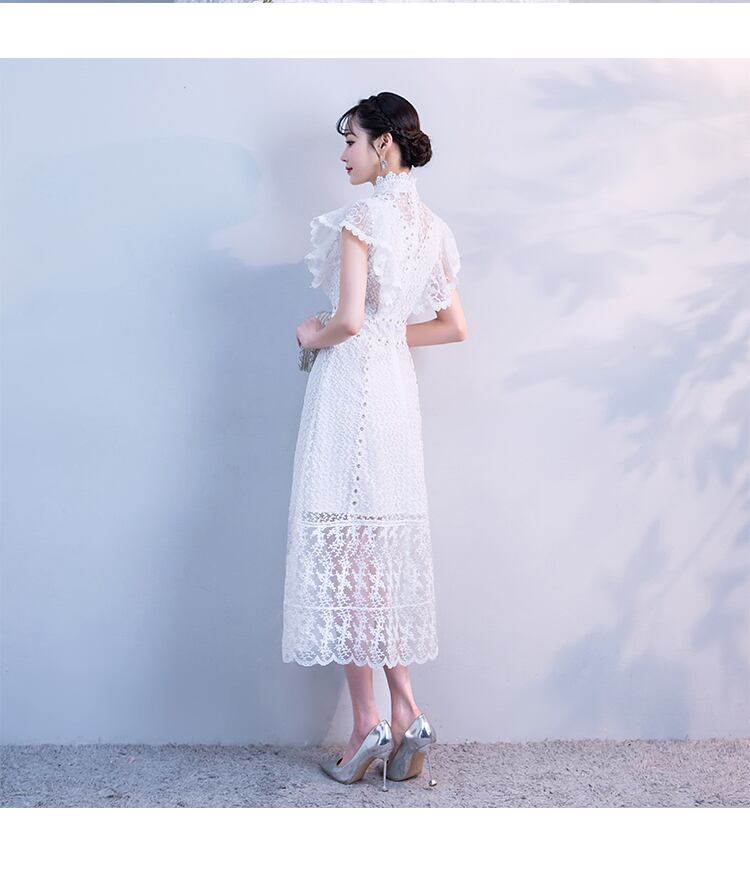 X-10076 レース ハイネック 総レース フレンチスリーブ フレア フリル袖 ロング丈 夏 ミモレ丈 上品 シースルー パーティ お呼ばれ エレガント 大人可愛い