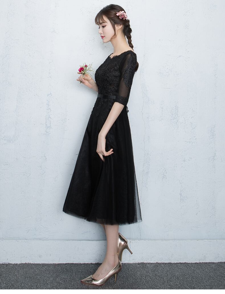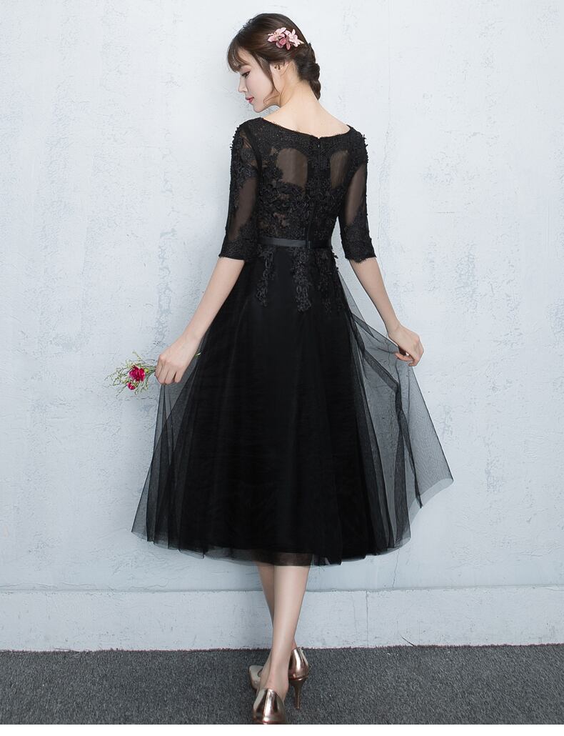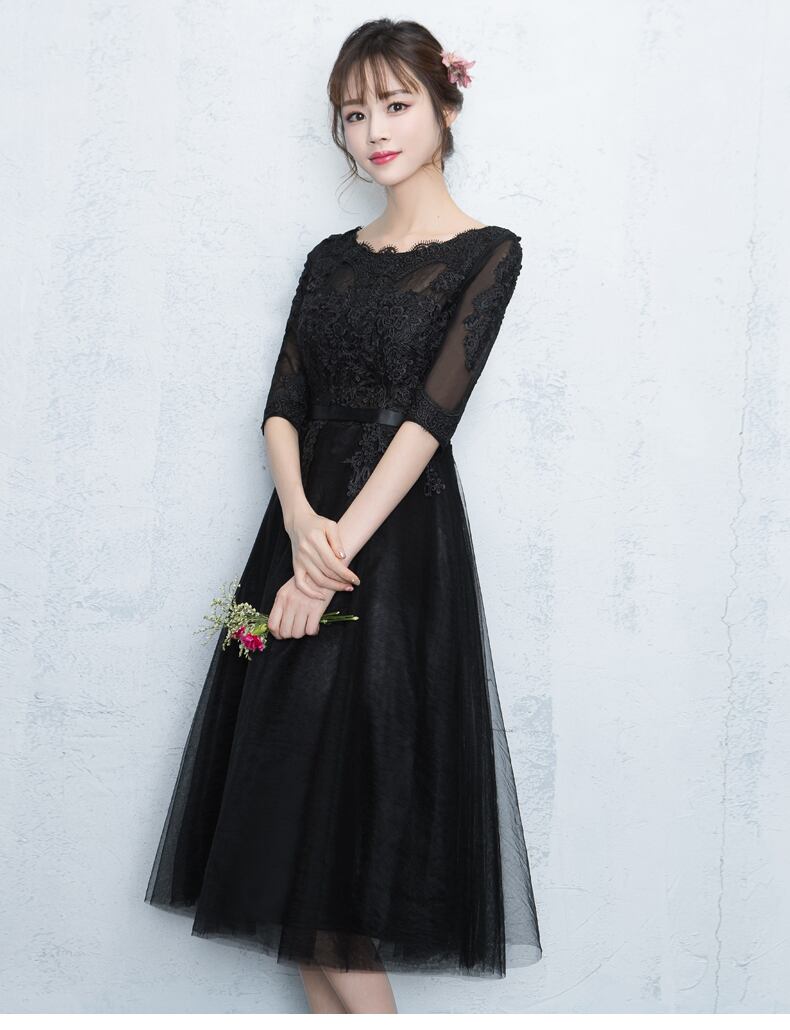 X-10092 Aライン チュール レース 刺繍 ミディアム丈ドレス ミモレ丈 ラウンドネック ブラック 7分袖 フレア 夏 結婚式 パーティー ノースリーブ Aライン お呼ばれ 上品 エレガント 大人可愛い シースルー