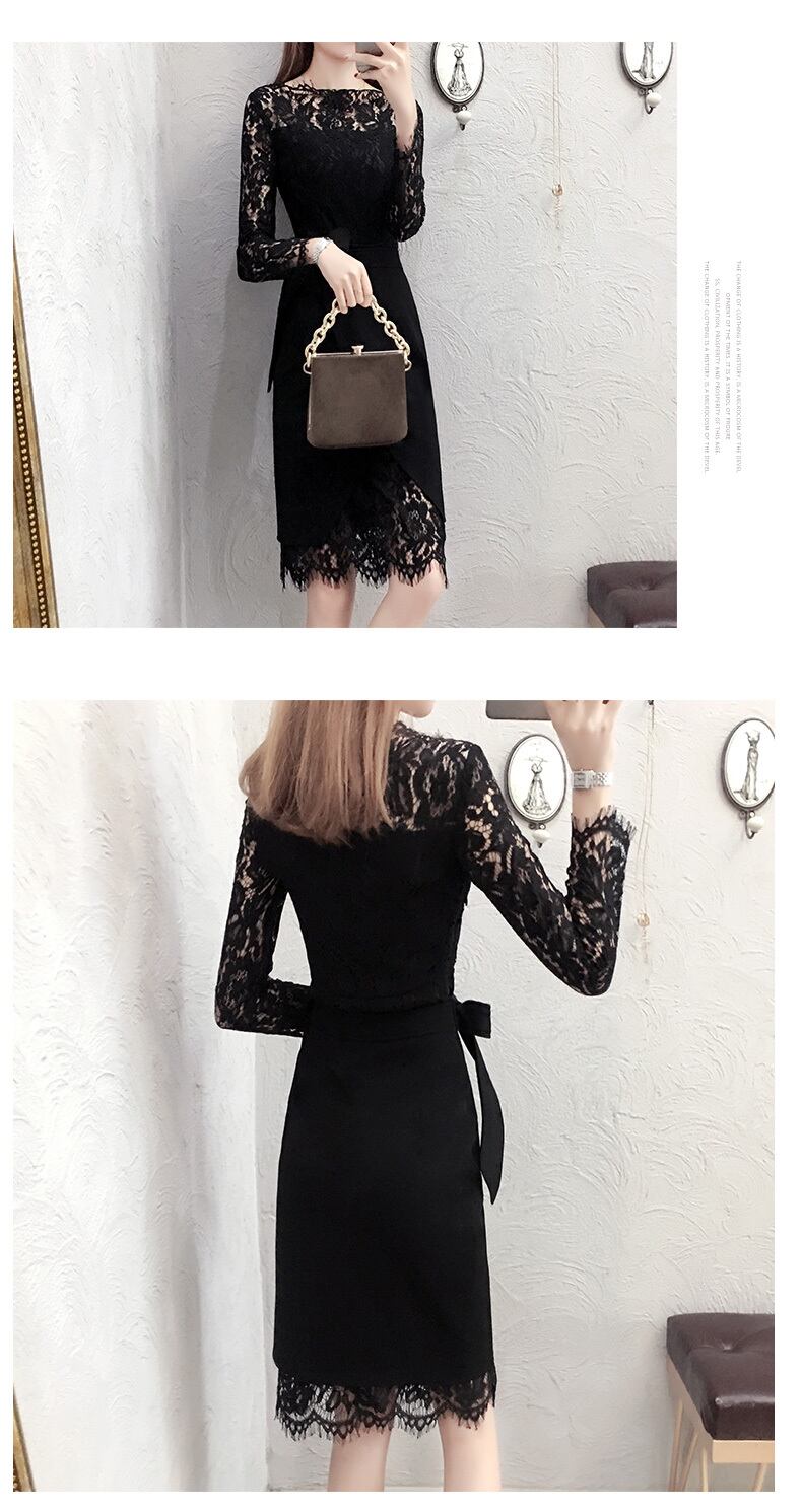 X-10106 ひざ丈ドレス リボン サイドリボン レース 花さ ラウンドネック タイト 長袖 夏 結婚式 パーティー お呼ばれ 上品 エレガント 大人可愛い シースルー