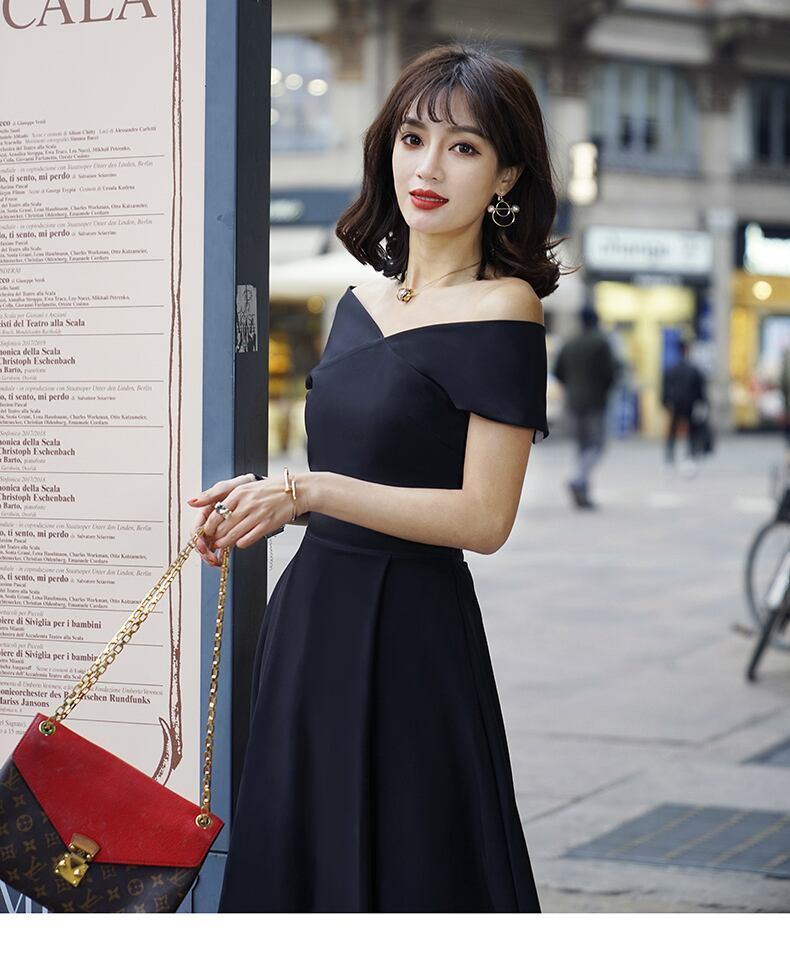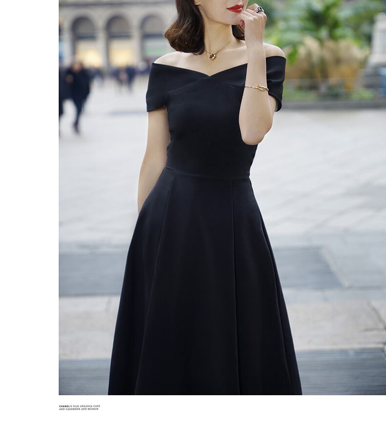 X-10118 ミモレ丈ドレス オフショルダー ブラック フレア 半袖 夏 結婚式 パーティー お呼ばれ 上品 エレガント 大人可愛い