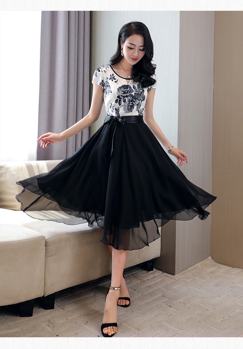 X-10119 ひざ丈ドレス 花柄 シフォン サイドリボン リボン フレア 半袖 夏 結婚式 パーティー お呼ばれ 上品 エレガント 大人可愛い 大きいサイズ