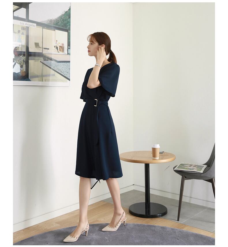 X-10127 ひざ丈 Vネック 5分袖 ベルト シンプル 秋 春 夏 クラシカル パーティー お呼ばれ 上品 エレガント 大人