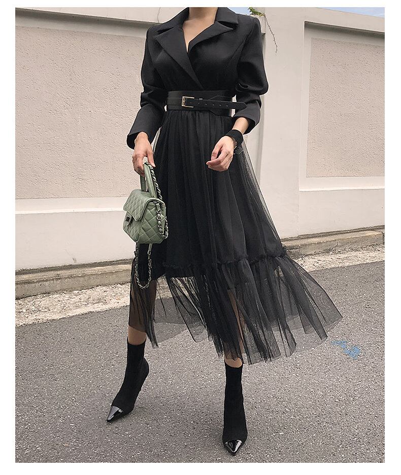 X-10132 ひざ丈ドレス チュール シャツドレス 長袖 シースルー ベルト ブラック 秋 春 夏 結婚式 パーティー お呼ばれ 上品 エレガント 大人
