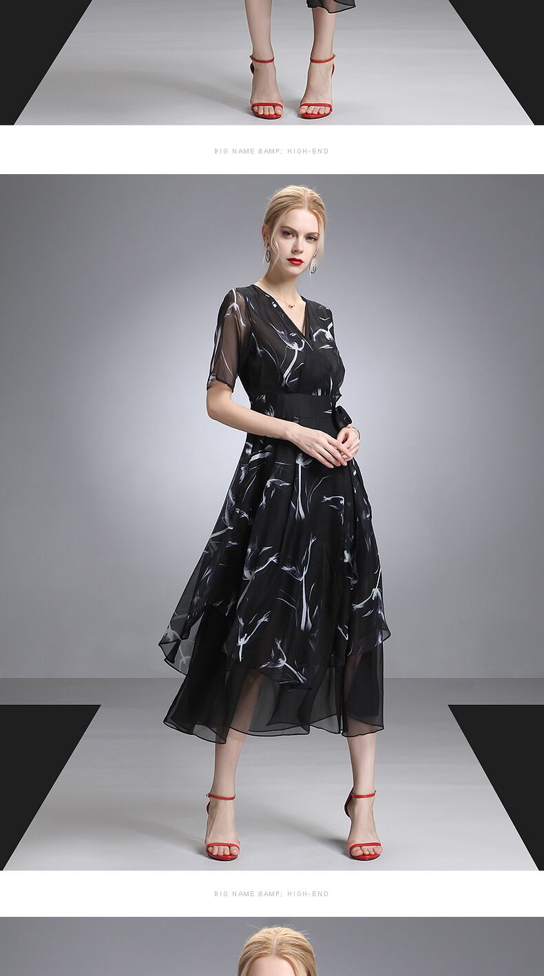 X-10141 マキシ丈ドレス シフォン 5分袖 フレア 花柄 Vネック 春 夏 結婚式 パーティー お呼ばれ 上品 エレガント 大人可愛い シースルー