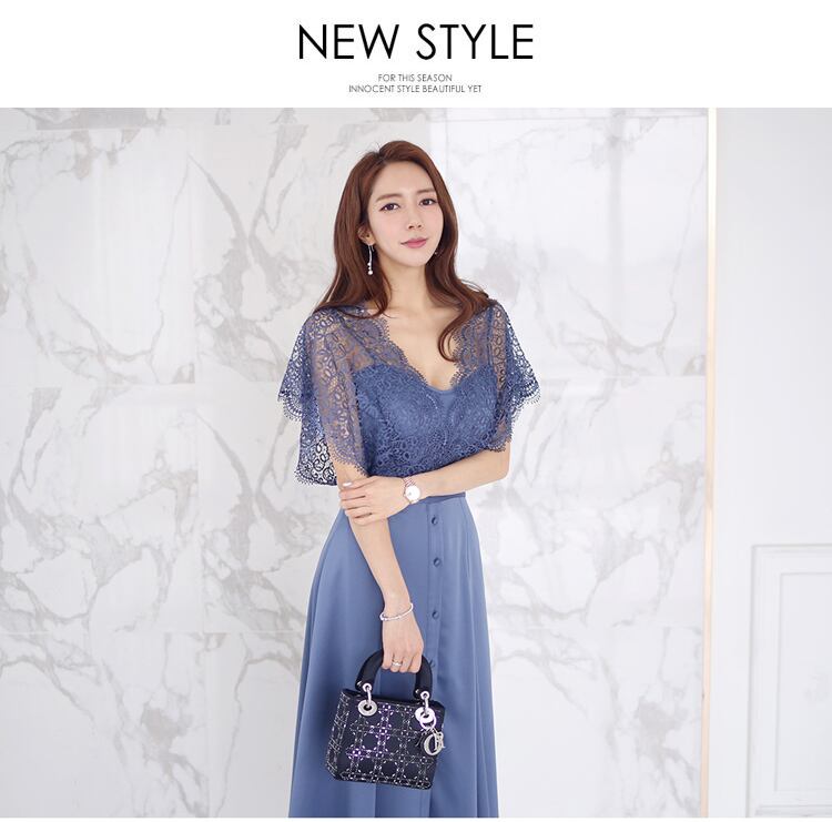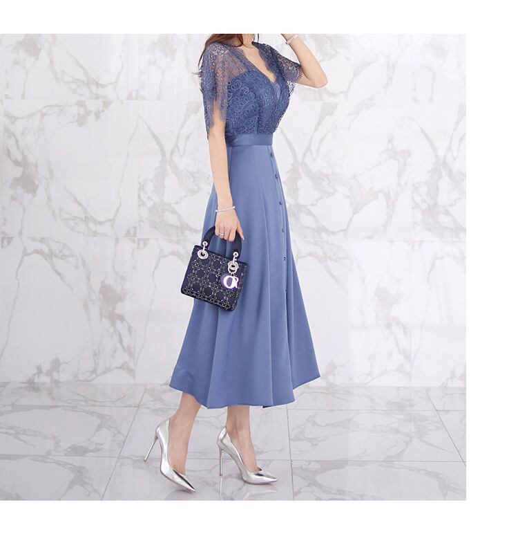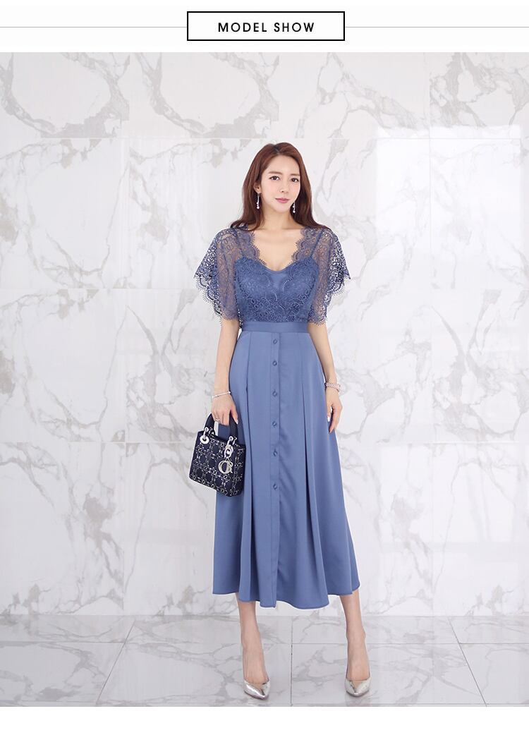 X-10143 ロング丈ドレス フレアスリーブ フレア ボタン レース Vネック 夏 結婚式 パーティー お呼ばれ 上品 エレガント 大人可愛い シースルー