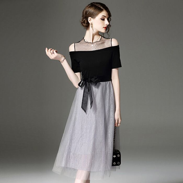 X-10149 ミモレ丈ドレス リボン オフショルダー レース シフォン フレア 夏 結婚式 パーティー お呼ばれ 上品 エレガント 大人可愛い