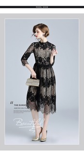 X-10151 レース バイカラー ミモレ丈ドレス 7分袖 フレア ブラック 結婚式 夏 秋 春パーティー お呼ばれ 上品 エレガント 大人可愛い
