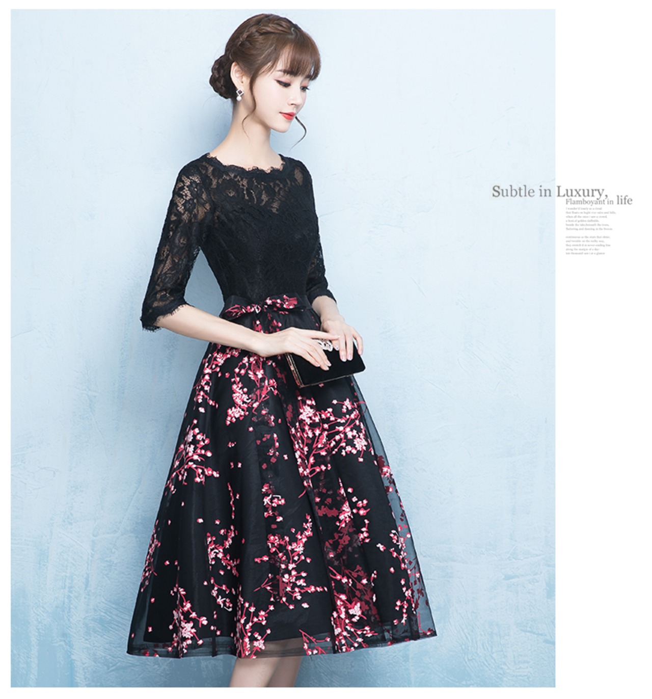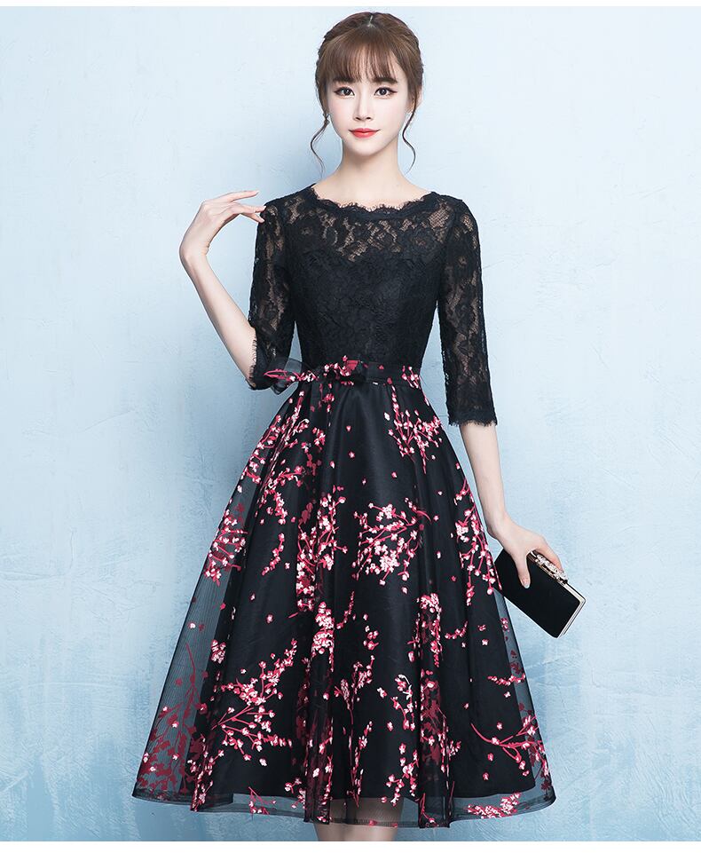X-10152 ドッキング ミディアム丈 7分袖 フレア レース 刺繍 結婚式 夏 春 秋 パーティー お呼ばれ ブラック 上品 エレガント 大人可愛い