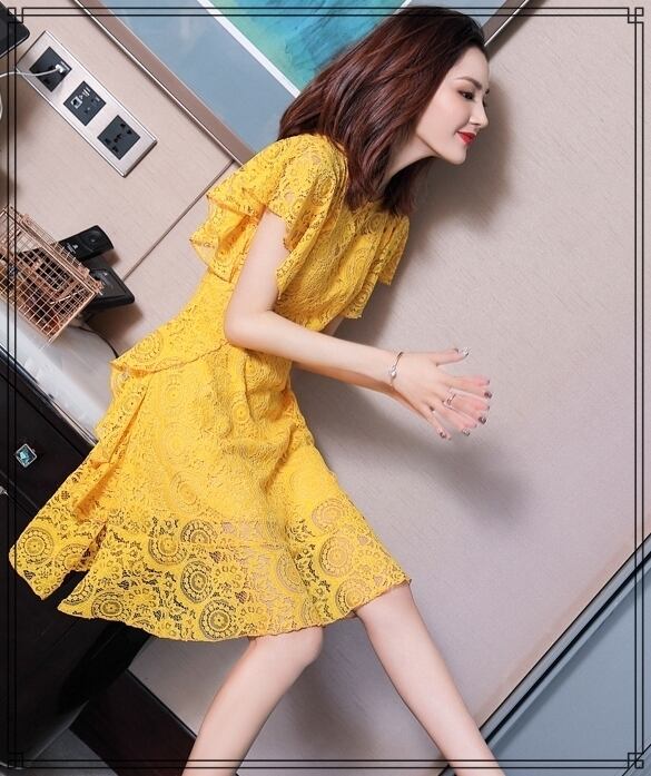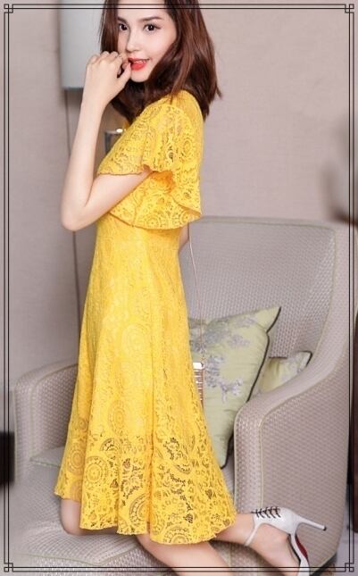 X-10155 ひざ丈ドレス レース シースルーフレアスリーブ フリル カラーバリエーション 夏 パーティー 結婚式 お呼ばれ 上品 エレガント 大人可愛い
