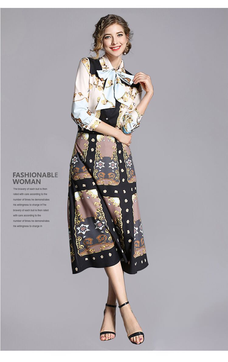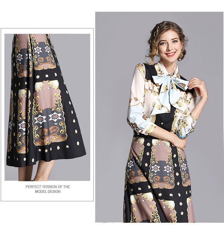 X-10158 ゆったり オスカル ロング丈 フレア 長袖 花柄 リボン ハイネック 夏 秋 春 パーティー お呼ばれ 結婚式 上品 エレガント 大人