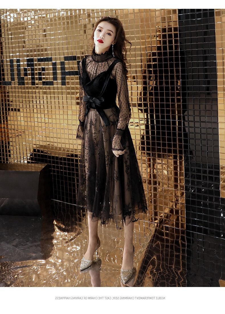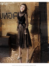 X-10168 プリーツ ミモレ丈 フレア 長袖 星 シースルー フリル リボン ハイネック 夏 秋 春 パーティー お呼ばれ 結婚式 上品 エレガント 可愛い