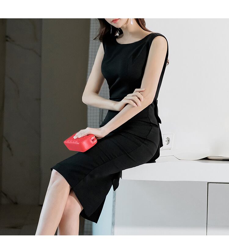 X-10172 タイト セクシー 背中開きブラック ひざ丈 リボン ノースリーブ ラウンドネック 夏 パーティー 結婚式 お呼ばれ 上品 エレガント 大人可愛い