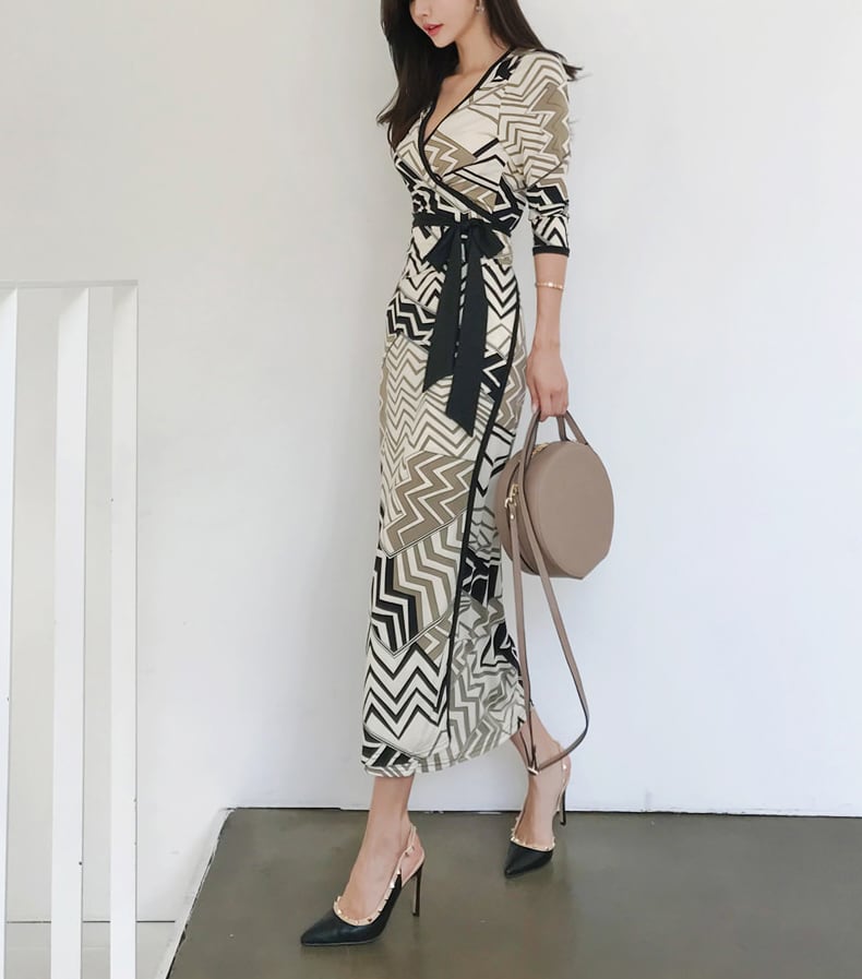 X-10181 Vネック ラップドレス ロング丈 リボン タイト エスニック柄 7分袖 結婚式 夏 春 秋 パーティー お呼ばれ 上品 エレガント 大人可愛い