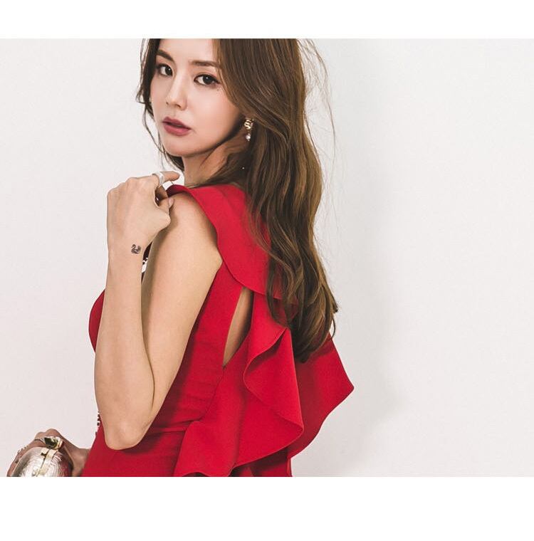 X-10187 ドレープ タイト ひざ丈 ノースリーブ フリル フレアスリーブ セクシー 夏 パーティー 結婚式 お呼ばれ 上品 エレガント 大人可愛い