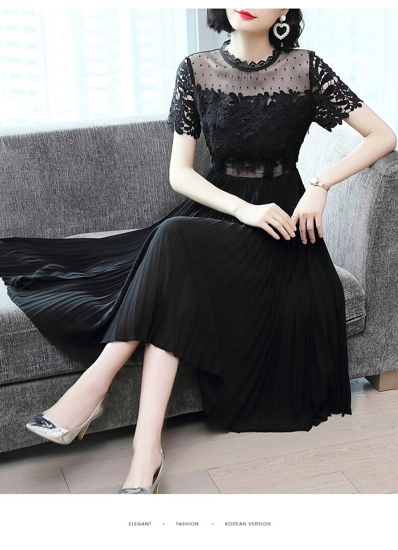 X-10189プリーツ レース シースルー ミモレ丈 半袖 ハイネック ボタニカル 夏 パーティー お呼ばれ 結婚式 上品 エレガント 大人可愛い