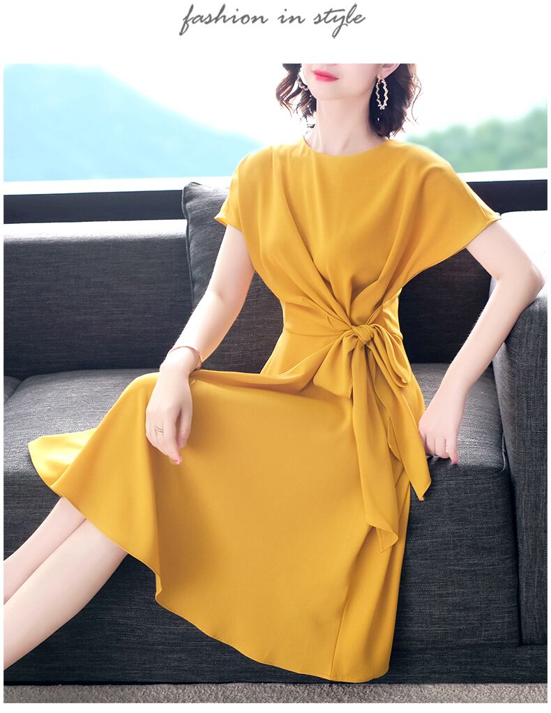 ウエストリボンがポイントなひざ丈ワンピースドレス。
