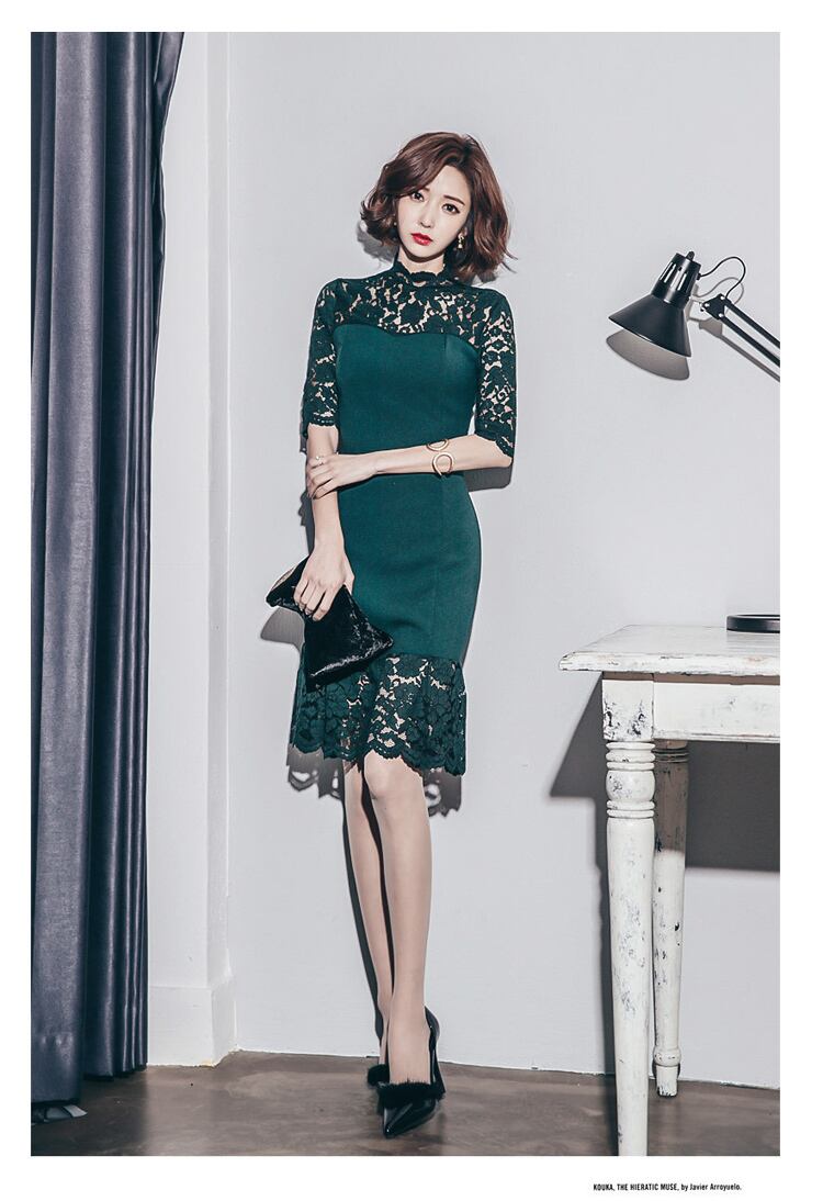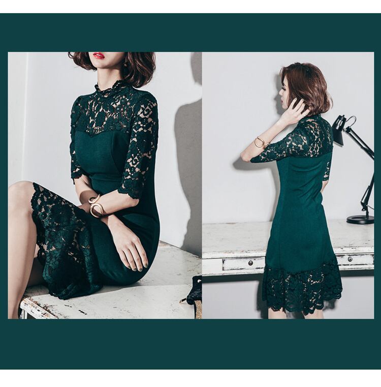 X-10192 ひざ丈 レース 花柄 ミディアム丈 タイト マーメイド 5分袖 フリル セクシー 夏 パーティー 結婚式 お呼ばれ 上品 エレガント 大人可愛い