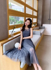 シースルーチュールが上品なミモレ丈ワンピースドレス。