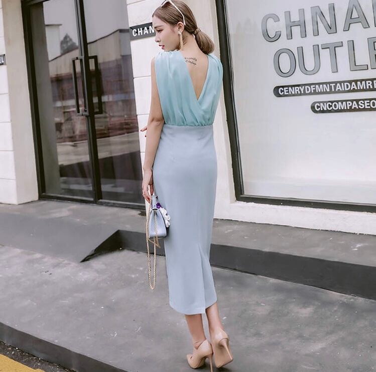 X-10205 タイト ミモレ丈 ロング丈 ノースリーブ Vネック デコルテ ドレープ 夏 結婚式 パーティー お呼ばれ 上品 エレガント 大人可愛い