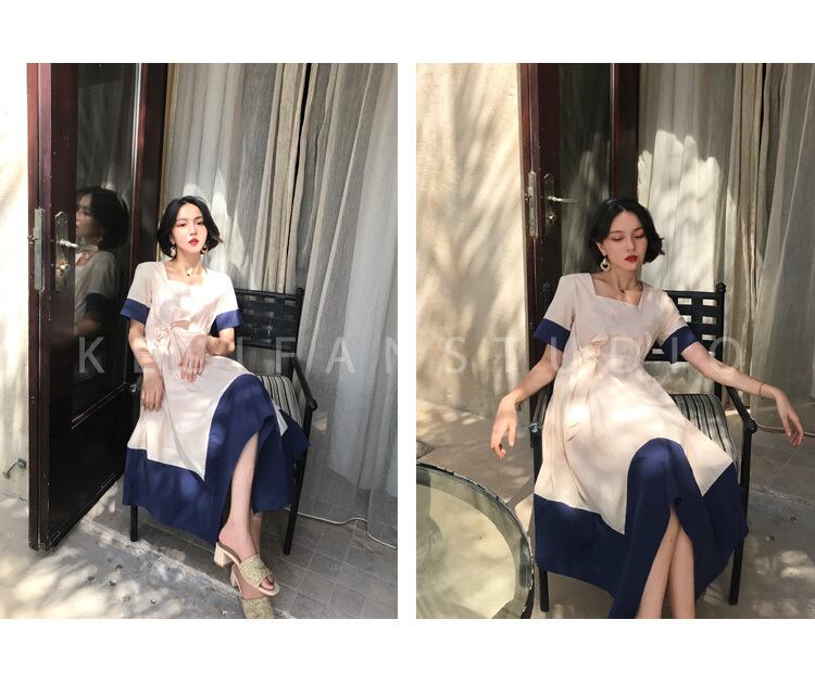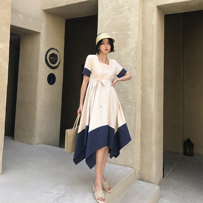 X-10220 ミモレ丈 バイカラー ひざ丈 アシンメトリー フレア イレギュラーヘム Aライン 半袖 リボン 夏 パーティー お呼ばれ 上品 エレガント 大人
