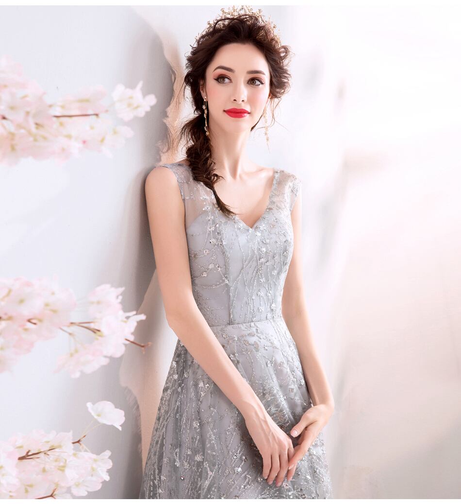 X-10238 マキシ丈 レース 刺繍 スパンコール ラメ フレア Vネック ウェディングドレス イブニングドレス シースルー ノースリーブ 花嫁 結婚式 華やか 夏 パーティー お呼ばれ 上品 エレガント 大人 可愛い